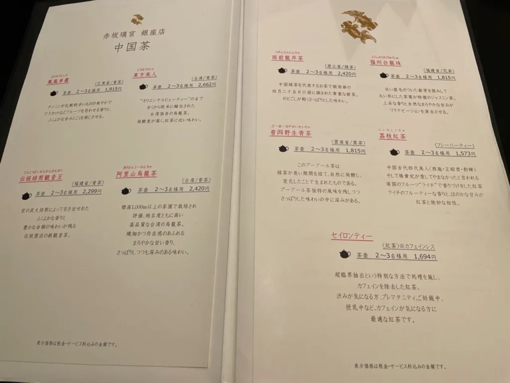 Tea service at Akasaka Rikyu is not an afterthought; it is an extension of the meal’s philosophy. The restaurant offers over ten varieties, each selected to complement specific dishes.