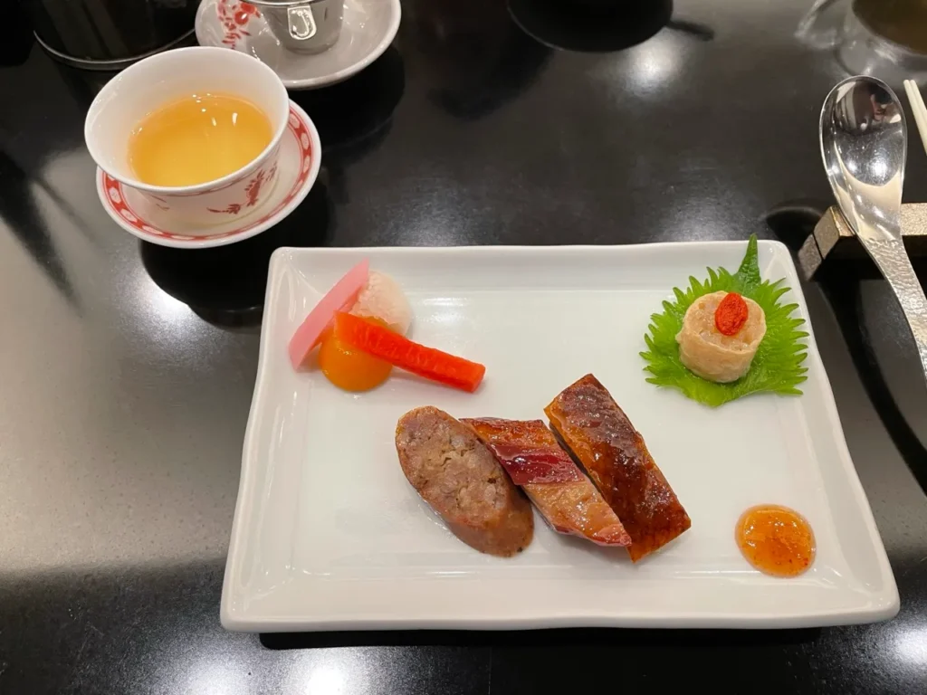 The course opens with the “Rikyu Special Assorted Appetizers (璃宮特製前菜盛り合わせ)”. It is a dazzling plate that captures the essence of Cantonese cuisine. The chilled jellyfish offers a delightfully crisp texture, serving as a luxurious prelude alongside the restaurant’s signature siu laap (roasted meats). The contrast between the tender, smoky duck and the juicy roasted pork is exquisite. Visually, the deep reddish-brown sheen of the duck and the golden caramelization on the pork create a striking presentation, while the sweet-savory aroma of five-spice and honey whets the appetite. The colorful arrangement draws the eye, and the finishing notes of sesame oil and tingling Sichuan pepper add a lively, aromatic accent.