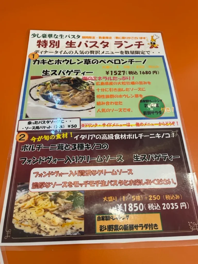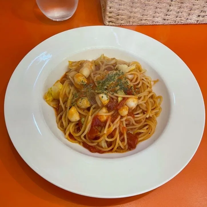 Lunch offerings include weekly specials and classic pastas, with a drink bar included for around ¥1,500. I went for the spring-limited pasta: Fresh Spaghetti with Baby Scallops and Spring Cabbage in Tomato Sauce (小柱と春キャベツのトマトソース), a seasonal favorite that’s been trending on Instagram.