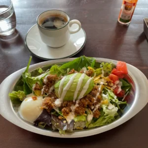 The set’s salad features colorful grilled vegetables with a tangy dressing that whets your appetite, and a relaxed cup of coffee from the drink bar wraps up the meal perfectly. It was a spring lunch that satisfied both body and soul.