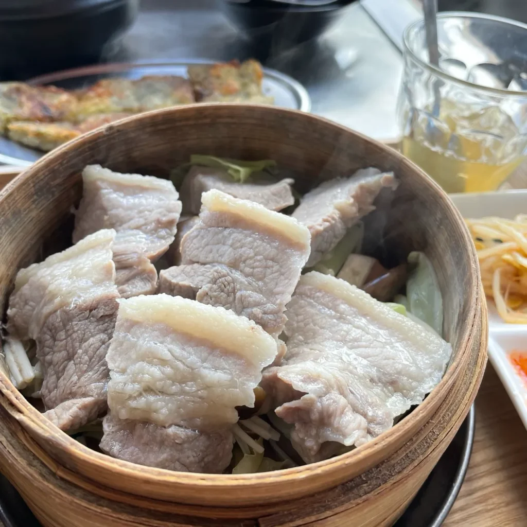 It’s as visually pleasing as it is flavorful — steaming white pork and vibrant vegetables arranged beautifully like an edible garden. The taste is balanced: refreshing herbs, just the right amount of fat, and that irresistible juicy yet clean finish. The side dishes — soup and kimchi — complete the perfect Korean lunch experience.