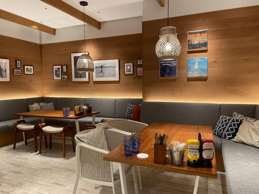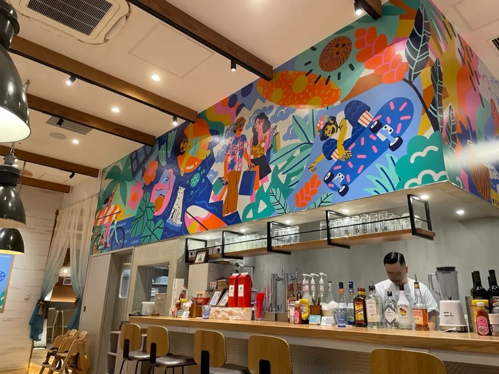The café’s interior feels like a bright, breezy resort. Art by Hawaiian-born artist Kim Sielbeck fills the walls with vibrant, ocean-inspired visuals, creating a light and open atmosphere. With a spacious layout featuring both sofa and counter seating, the restaurant suits a variety of occasions—from casual lunches and dinners to social gatherings and celebrations.