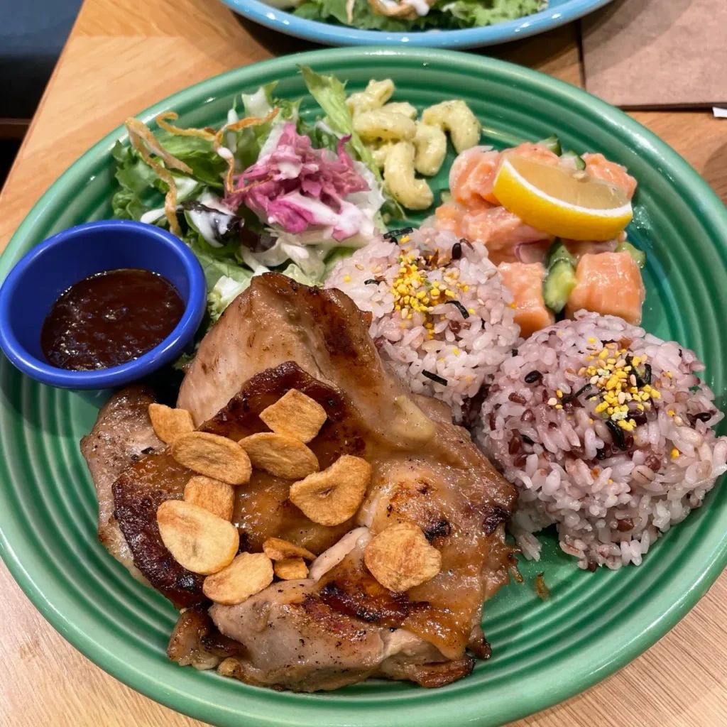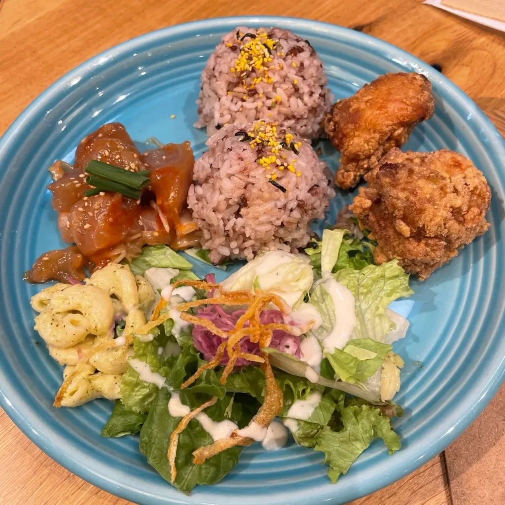 One of the restaurant’s most popular dishes is the Mochiko Combo Plate モチココンボプレート(¥1,200)—featuring two crisp-on-the-outside, tender-on-the-inside mochiko chicken pieces paired with fresh ahi poke. The combination of sweet-and-savory chicken and spicy-marinated tuna (スパイシーアヒポキ) delivers both visual appeal and rich flavor, earning high praise from guests for its balance and satisfying portions.