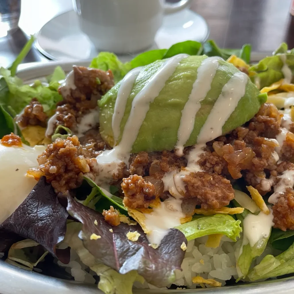 Each bite brings together layers of flavor—the savory richness of the meat, the tangy brightness of tomato, and the refreshing crunch of lettuce, all harmonized by the café’s original salsa sauce. Reviews praise its “perfect balance” and “healthy yet hearty” portions. It’s especially popular among women and people working remotely in the Yoga area.