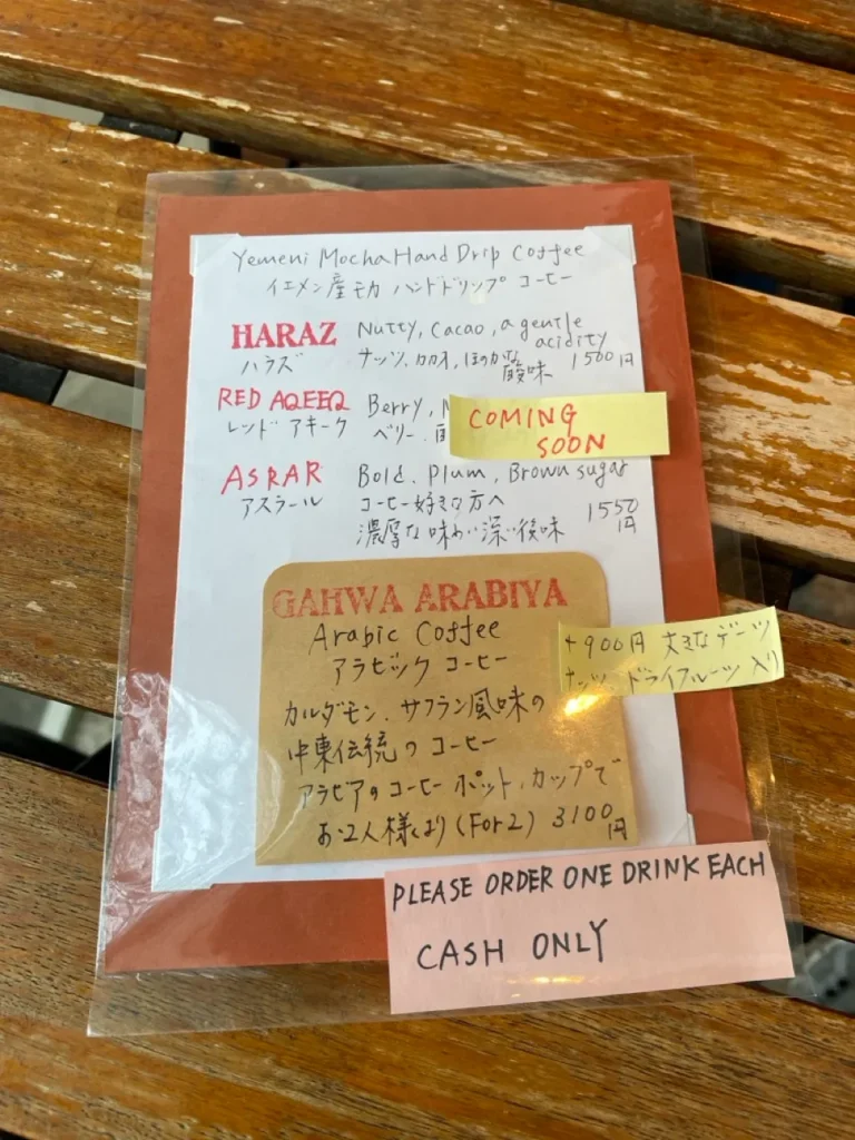 Mocha Coffee is more than a café—it’s a peaceful refuge for travelers and Tokyo locals alike. Here, you can sip world-class Yemeni coffee while surrounded by the charm of Arabic culture, just minutes away from the city’s trendiest boutiques.