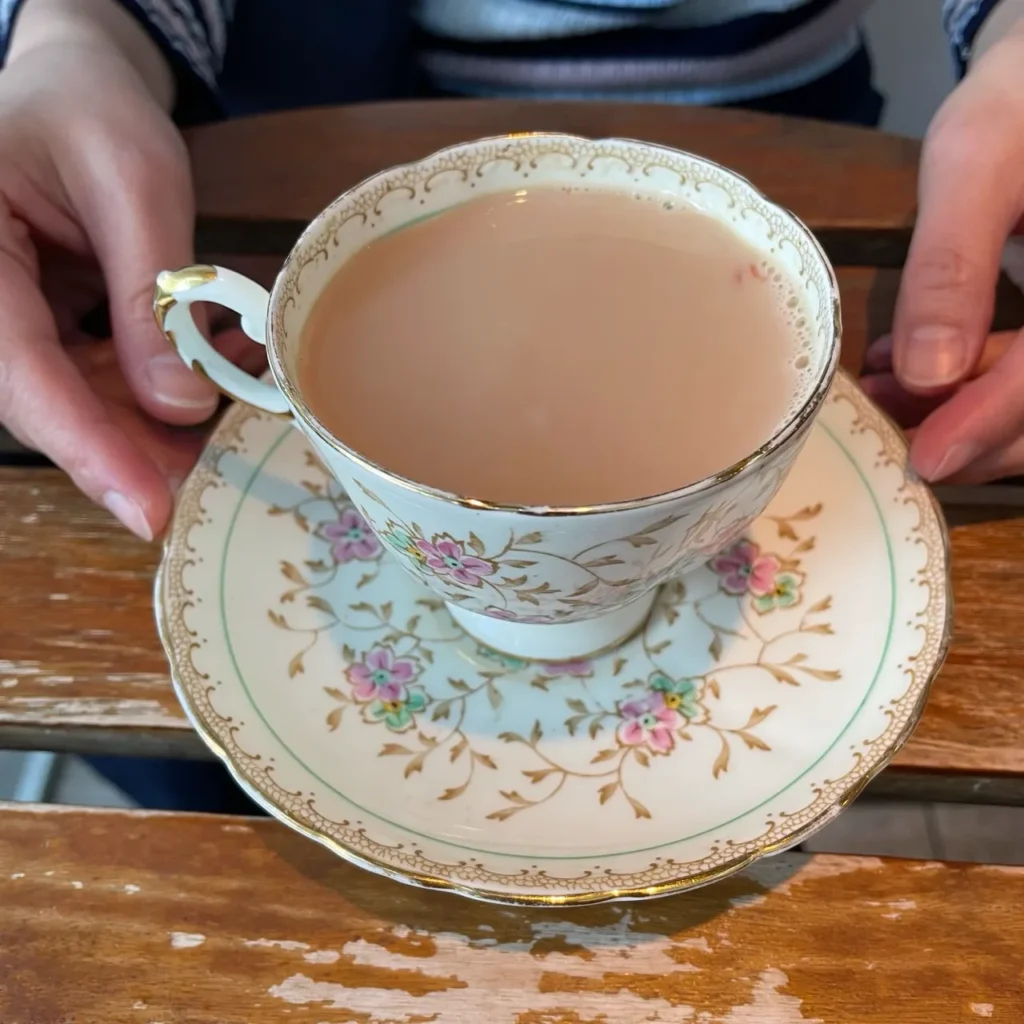 Another star of the menu is the Arabic Milk Tea Karak (¥1,050)—a creamy, spiced milk tea infused with cardamom and saffron. It arrives in a vintage-style cup on a pink floral saucer, its pale creamy foam rising like clouds.