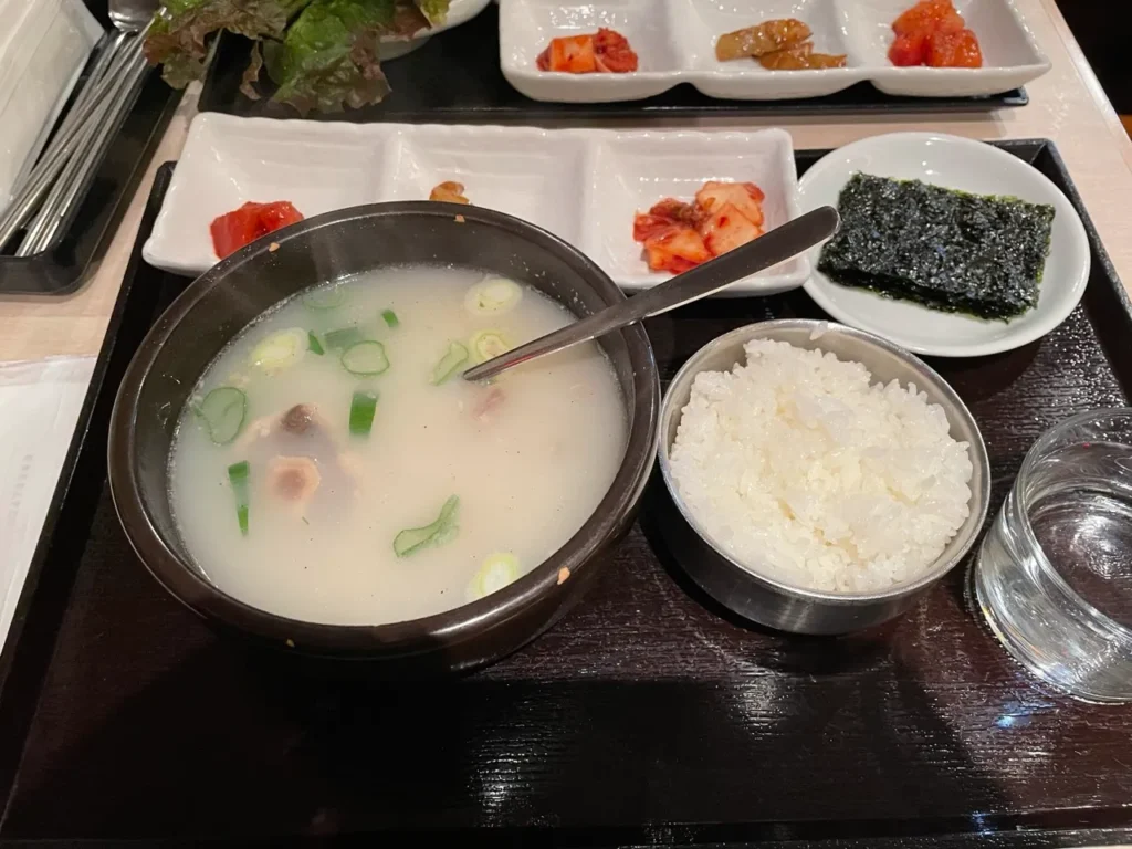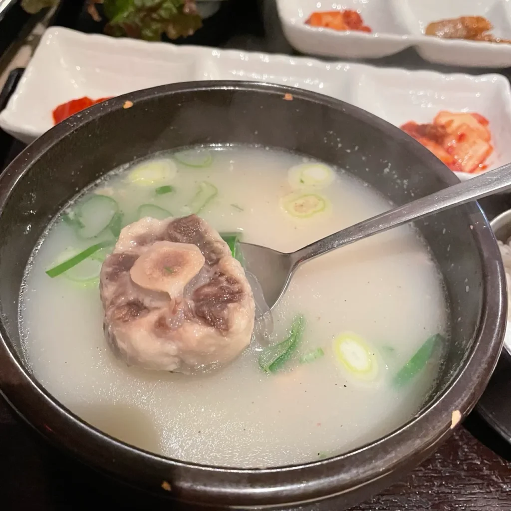 If the samgyeopsal set is bold and assertive, the gomtang set (コムタン) is quiet and comforting. As soon as it’s placed on the table, a soft, milky-white broth steams gently, releasing hints of beef bone and scallion. The first sip surprises you with how mild it tastes—lightly seasoned, yet deeply flavorful from the long-simmered bones and meat, gliding soothingly across your tongue.