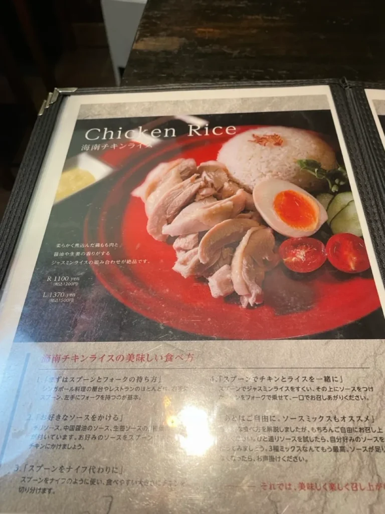The star of the menu is undoubtedly the Hainanese chicken rice (海南チキンライス). Fragrant jasmine rice glistens with aromatic chicken oil, releasing hints of ginger and garlic. Each bite of the tender chicken melts in your mouth, especially when dipped into one of three sauces—chili, oyster, or ginger. It’s the kind of comfort food that keeps you coming back.
