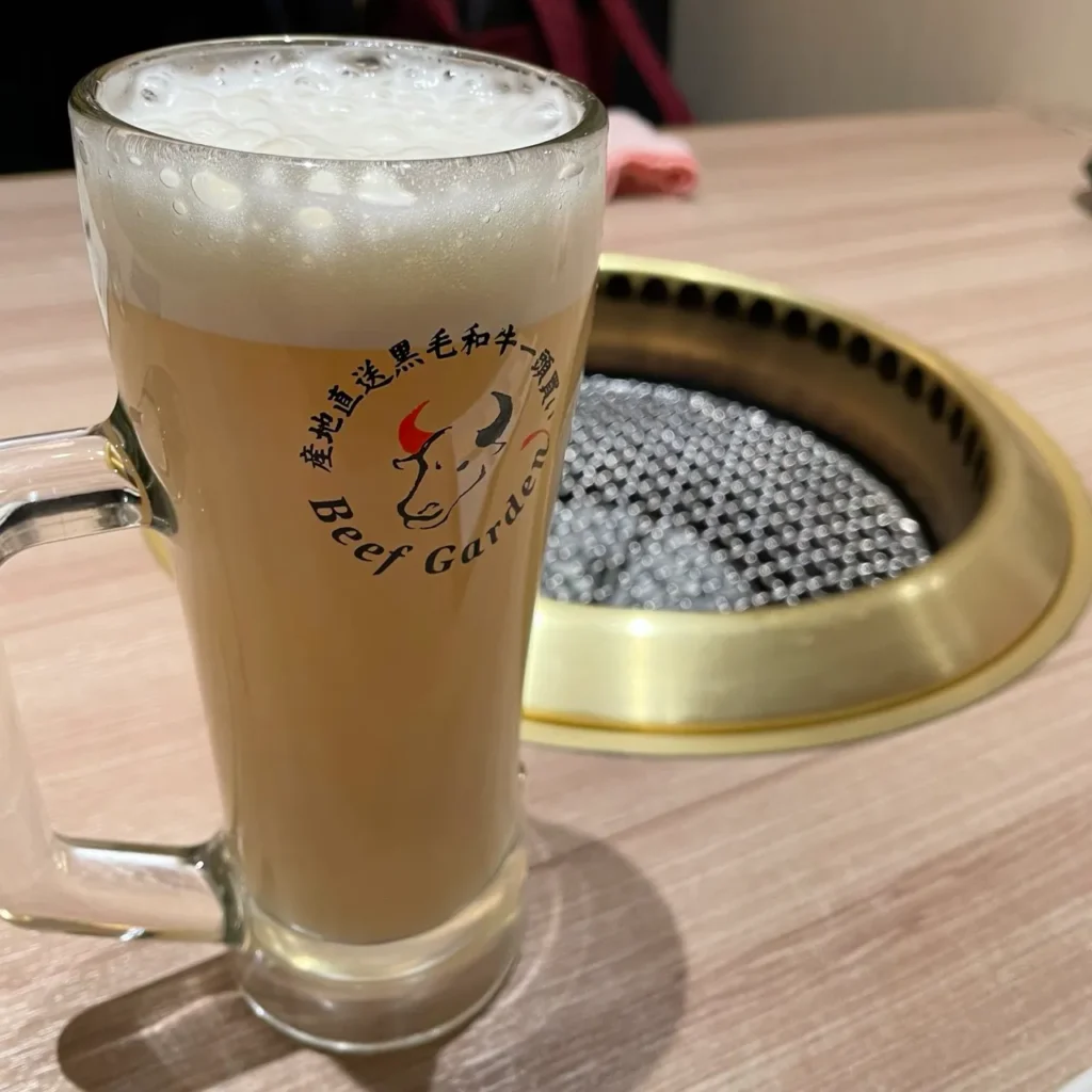 To refresh after the grilled feast, I tried the signature Makgeolli Beer (マッコリビアー), a creative blend unique to BeefGarden. The drink combines the soft sweetness of Korean makgeolli with the light bitterness of beer hops, producing a fruity aroma and perfectly crisp finish. It’s the ideal palate cleanser after rich yakiniku.