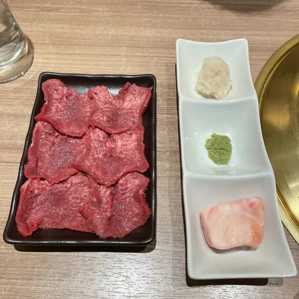 Next came the must-try Fresh Tongue with Salt (生タン塩) — a dish that truly defines fresh Wagyu yakiniku in Japan. Unlike ordinary tongue, these thick slices arrive never frozen, glistening with freshness and topped with minced green onion and crunchy tempura flakes.