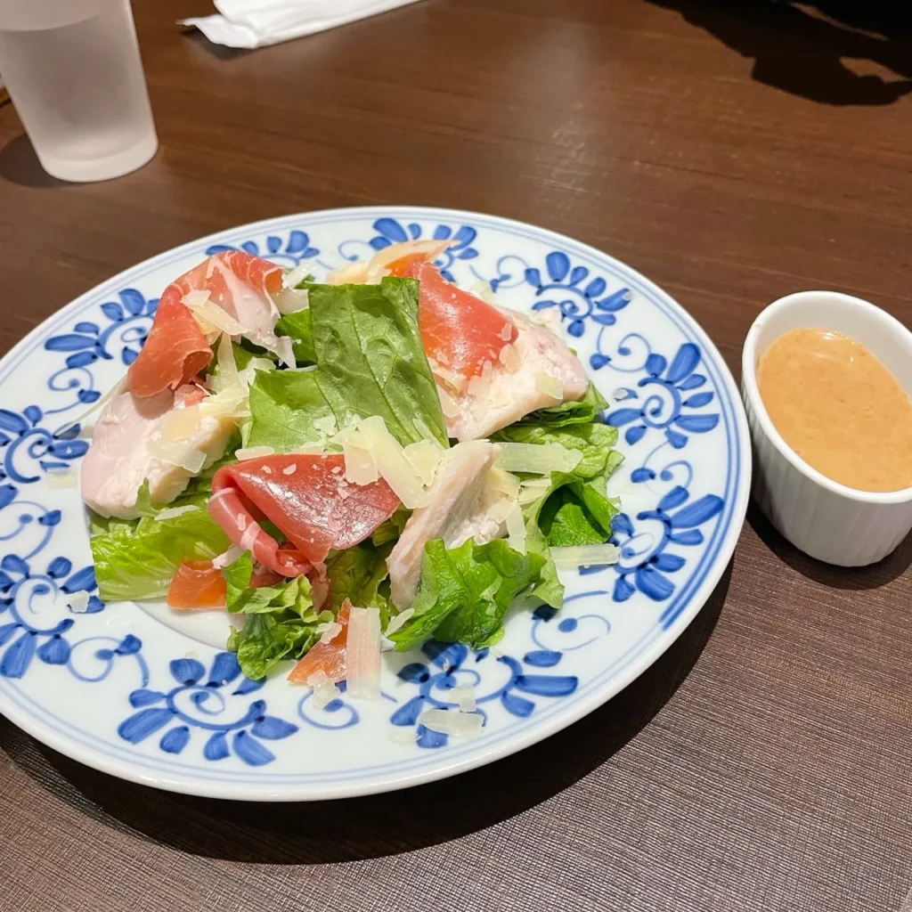 The meal begins with a feast for the eyes and palate. The Sakura-hime Chicken and Jamón Serrano Salad (桜姫鶏とハモンセラーノのサラダ) features delicate pink slices of Japanese chicken layered with deep red prosciutto and topped with snowy Pecorino cheese. The aroma of aged ham mingled with juicy chicken is intoxicating, while the flavor delivers a harmonious balance of sweet and savory. With crisp lettuce adding texture, each bite feels fresh, light, and perfectly balanced—earning rave reviews as a must-try starter for dinner.