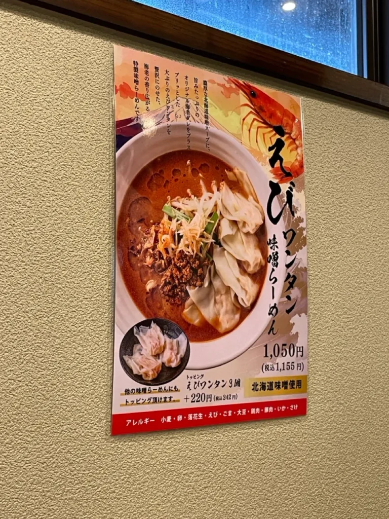 A sip of the Ebi Wonton Miso Ramen (えびワンタン味噌らーめん) reveals a perfect harmony between shrimp umami and miso depth. The soup is thick yet never overpowering, coating the noodles just enough to carry the flavor in every mouthful. The shrimp wontons pop with rich, compacted sweetness—an explosion of seafood essence in each bite.