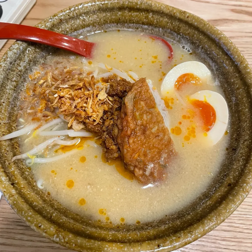 The shop offers a lineup of miso ramens from across Japan, including Hokkaido Miso, Kyushu Barley Miso, and Ise Miso. This “miso tasting tour” experience has earned it high ratings on food sites like Tabelog, where reviewers praise the “depth of miso flavor” and “variety of choices.” At around ¥1,200 per bowl, the ramen here is both hearty and affordable, especially with toppings like the signature miso-marinated egg 味噌漬け煮玉子.